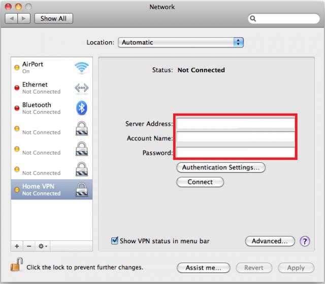 شبکه ایجاد شده در سمت شبکه را مشخص کنید و آدرس IP را در خط Server Address وارد کنید. اکنون نام کاربری Mac خود را در فیلد Name وارد کنید و Authentication Settings را انتخاب کنید. رمز عبور وابسته به نام کاربری و کلمه عبور اضافی (اگر آن را انتخاب کرده اید) را وارد کنید و سپس بر روی OK کلیک کنید. هنگامیکه به پنجره Network برگشتید گزینه Show VPN status in menu bar را تیک بزنید و Apply را برای ایجاد شبکه VPN جدید خود انتخاب کنید.